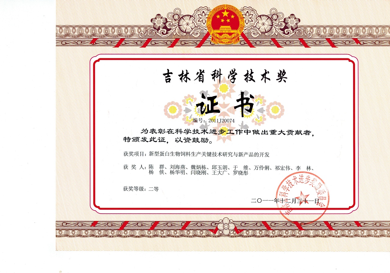 吉林省科学技术奖二等奖:新型蛋白生物饲料生产关键技术研究与新产品开发