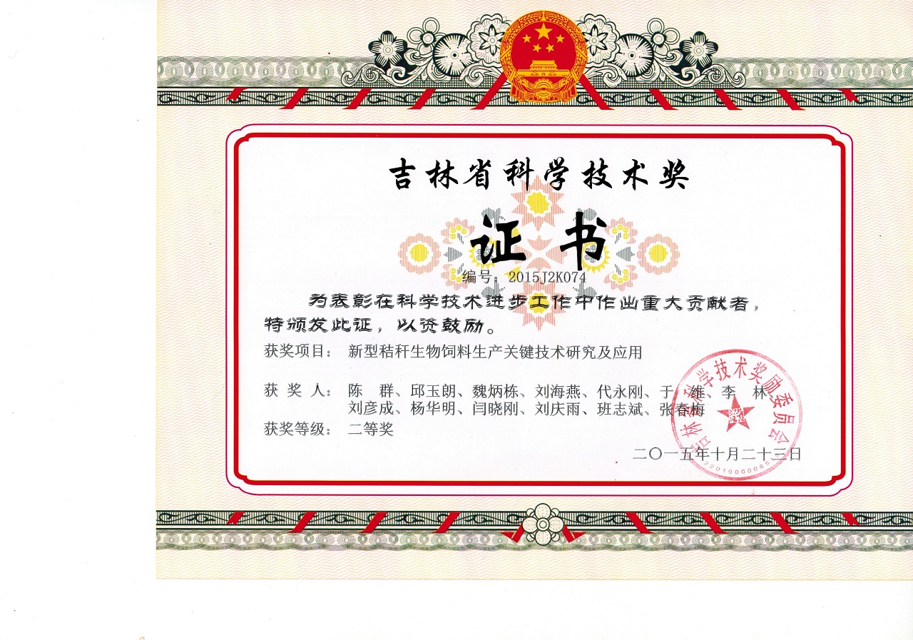 吉林省科学技术奖二等奖:新型秸秆生物饲料生产关键技术研究与应用