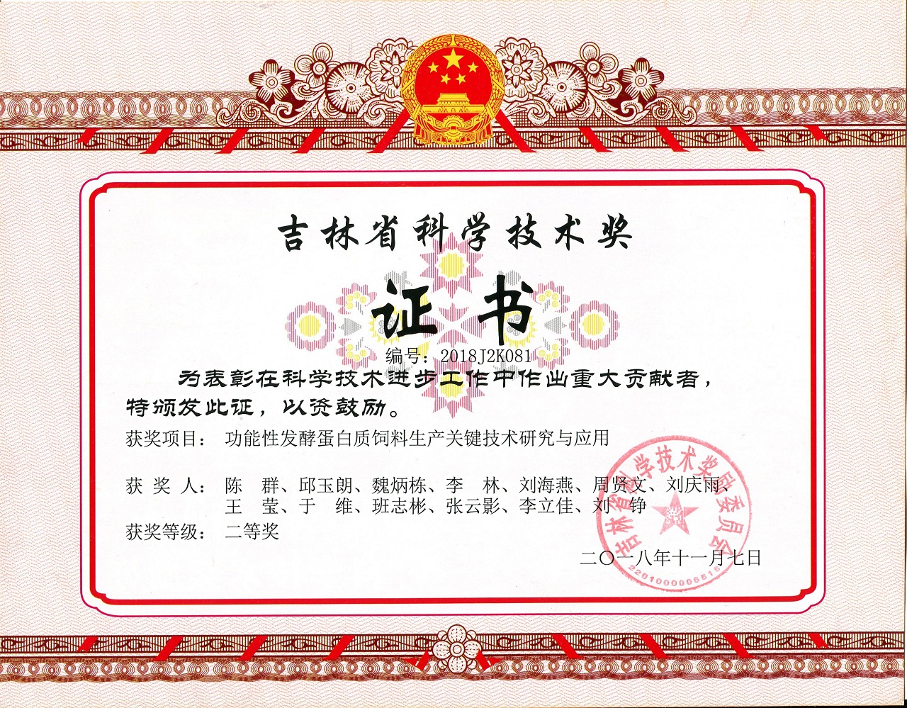 吉林省科学技术奖二等奖:功能性发酵蛋白质饲料生产关键技术研究与应用